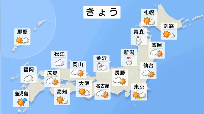 きょうの各地の天気です。その寒気の影響が残って、北陸から北の日本海側では断続的に夜にかけて雪が続きます。特に発達した雪雲が流れ込む新潟県など北陸では、雪の強まるところがあるでしょう。また、九州はゆっくりと天気下り坂です。鹿児島は夕方以降、本降りの雨の範囲が次第に広がる見込みです。