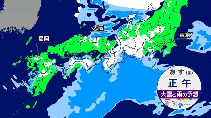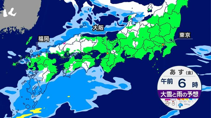 あすの日中はこの雪や雨の範囲が東日本へと広がります。関東も早いところは昼から雨が降り出す見込みです。内陸では白の表示、雪が降るでしょう。