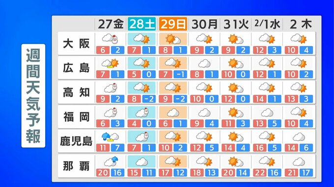 週間予報です。あすの雨や雪の後はまた西日本に強い寒気が流れ込みます。あすの午後から土曜日は九州で再び雪が降って風も強まるでしょう。