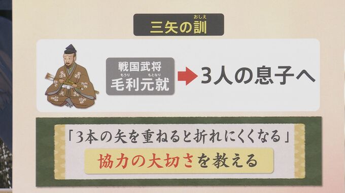戦国武将・毛利元就。3人の息子へ「1本では折れやすい矢でも、3本の矢を重ねると折れにくくなる」と、協力することの大切さを教えたという有名な説話があります。三矢の訓「さんしのおしえ」・「みつやのおしえ」などといいますが、これを彷彿とさせる方々をご紹介します。