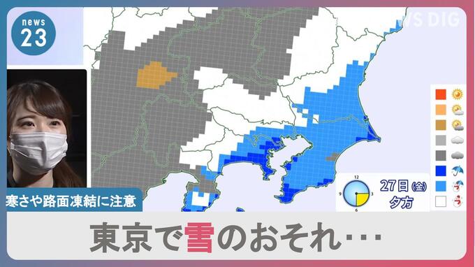 最強寒波による路面凍結などで、各地で事故が相次ぎました。27日は東京でも雪が降る可能性があり、寒さや路面凍結に注意が必要です。27日、夕方を中心に雪が降る見込みの東京。26日朝は今シーズン最低の-3.4℃を…