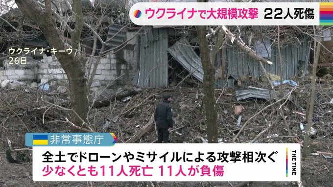欧米がウクライナへの主力戦車の供与を決めるなか、ウクライナ全土でロシアによる大規模な攻撃があり、11人が死亡しました。非常事態庁によりますと、ウクライナ全土で26日、ドローンやミサイルによる攻撃が相次ぎ…