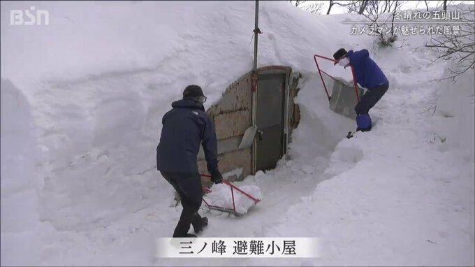 三ノ峰の積雪は3メートル。避難小屋のまわりは、地域の山好きが集まって除雪しています。使うのは自前のスノーダンプなんだとか。