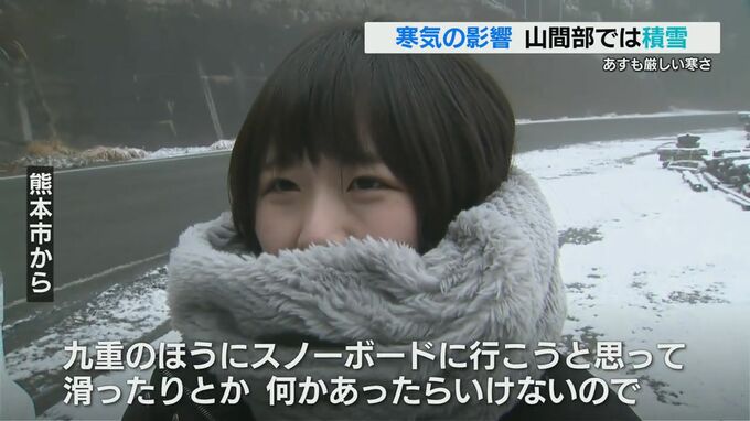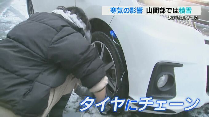 タイヤにチェーンを巻いていた女性「九重にスノーボードに行こうと思って。滑ったりとか何かあったらいけないので」