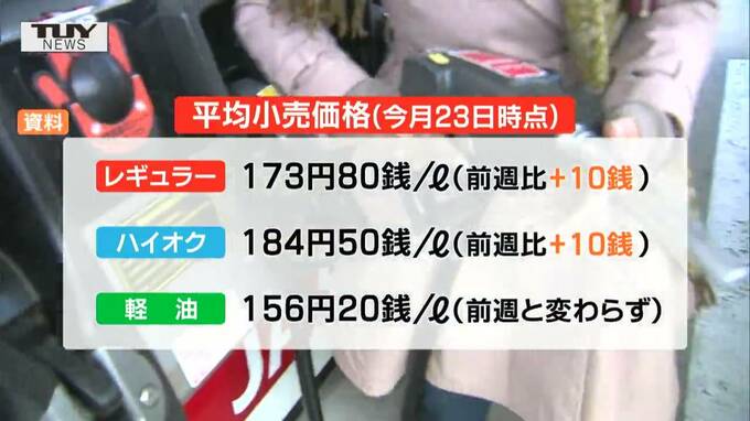 山形県内最新のレギュラーガソリンの平均小売価格は173円80銭で、前の週とほぼ横ばいになりました。資源エネルギー庁によりますと、今月23日時点の県内レギュラーガソリンの平均小売価格は、1リットルあたり前の週…
