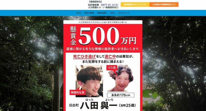 逃走している八田與一容疑者の一日も早い逮捕につなげようと遺族や友人らが11月、最大で500万円の私的懸賞金を出すことを決め、情報提供を呼びかけるホームぺージを立ち上げた。サイトには有志たちが独自に入手した八田容疑者の写真や動画、身体的な特徴も記載。