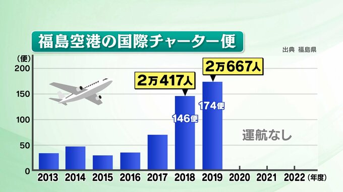 福島空港の国際チャーター便は、震災後から徐々に回復し、2018年には一気に146便、翌年の2019年には174便と利用者はいずれも2万人を超えていました。
