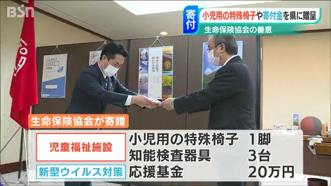 贈られたのは児童福祉施設の支援として、小児用の特殊な椅子や知能検査器具と、新型ウイルス感染症対策などの応援基金20万円です。