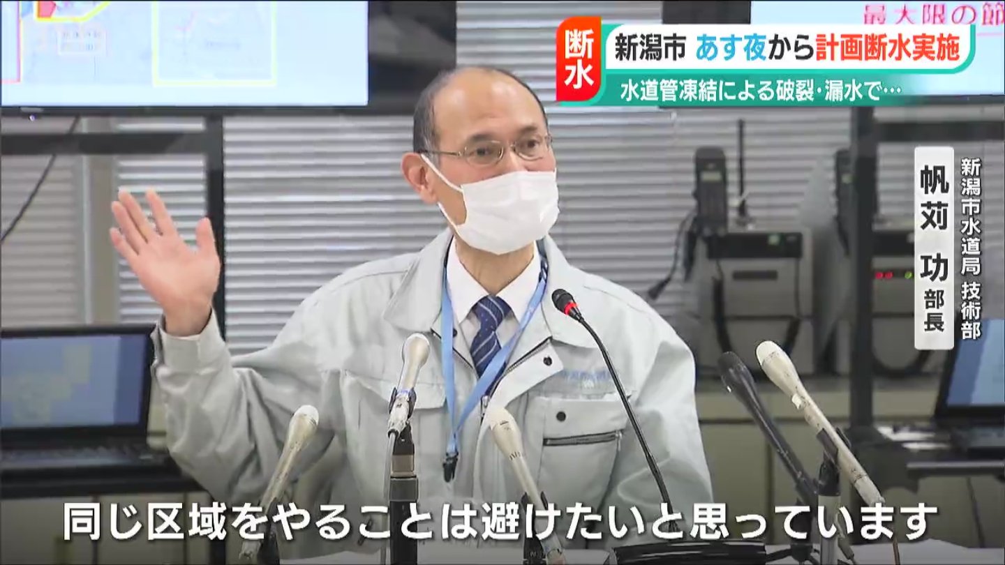 【新潟市水道局 帆苅功 部長】「マイナス5度とか氷点下の気温が連続するとか、強風が重なるとか、同じようなことが繰り返されれば(断水は)仕方ないですけど、同じ区域をやることは避けたいと思っています。凍結防止のために一晩中、極端な話、一日中ずっと流しっぱなしにするとかを控えてくださいということを繰り返し言っていきたい」