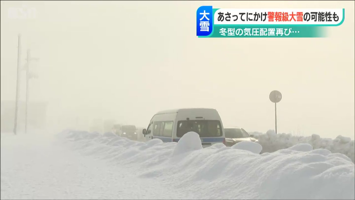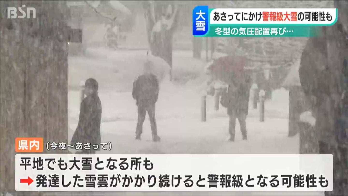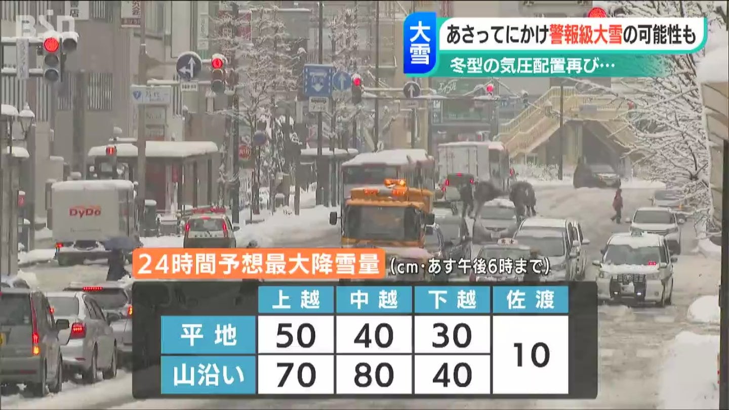 今後日本付近は次第に冬型の気圧配置となる見込みで、新潟県内では平地を含めて29日にかけて大雪となる所があり、発達した雪雲が同じ所にかかり続ければ警報級の大雪となる可能性があります。