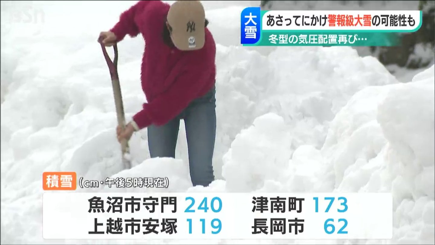 長岡市では午前4時までの24時間で55cmの雪が降った他、午後5時の各地の積雪は、魚沼市守門で2m40cm、津南町で1m73cm、十日町市で1m23cmなど、多くの地点で平年を上回っています。