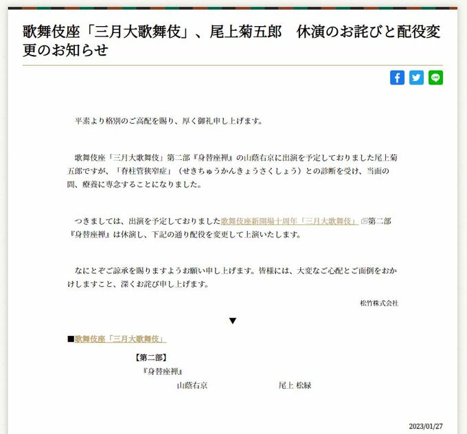 歌舞伎俳優の尾上菊五郎さんが「脊柱管狭窄症」のため「三月大歌舞伎」を休演することが歌舞伎座から発表されました。