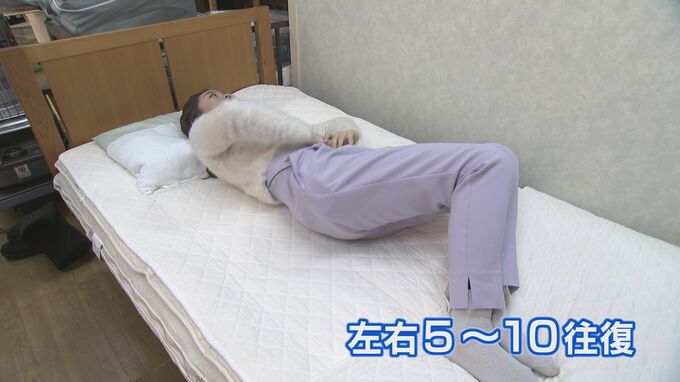ねむり家 大郷卓也さん:「頭を上げずにそのまま肩と連動して行くようなイメージ。左右5往復から10往復。単純な体操なんですけど、無意識の小さいピクピクっていう寝返りが戻ってきますので朝起きて肩腰の痛みはなくなります」
