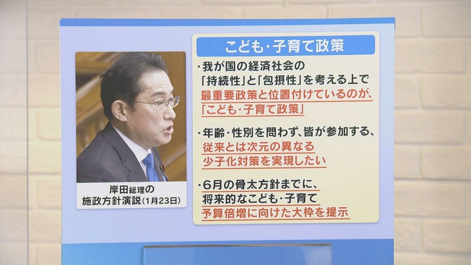 施政方針演説では「こども・子育て政策」を最重要政策と位置付け、6月の骨太方針までに、将来的なこども子育て予算倍増に向けた大枠を提示するとした。