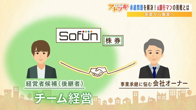 SoFunが考えたのは、第三者による承継が当たり前にできる仕組みづくり。考えたのはこうです。面談などを経て発掘した、経営にチャレンジしたい候補者と共に、承継する企業を探します。事業継承に悩む会社オーナーとの協議を重ねるなど事業引き継ぎの縁を取り持ちますが、経営リスクを後継者1人に背負わせないため、SoFunが会社の株を買い取り、引き継いだ後も後継者と一緒にチーム経営で会社の成長を支えるというものです。