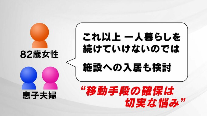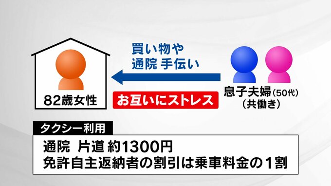車がなくなったことで、買い物や病院へ行くことも困難になり、市内に住む50代の息子夫婦が手伝っている状態ですが、共働きのため都合がつかないこともあり、お互いにストレスを溜めているといいます。