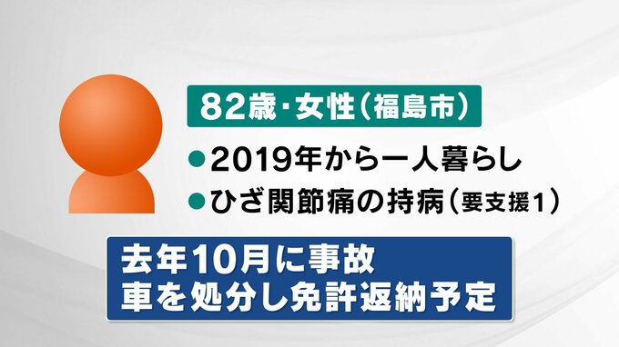 女性は福島市に住む82歳で、2019年に夫を亡くしてから一人暮らしをしています。ひざ関節痛の持病があり、最近では歩くのもやっとで「要支援1」と認定されています。去年10月に事故を起こしてしまったことをきっかけに車を処分し、免許は返納する予定だそうです。