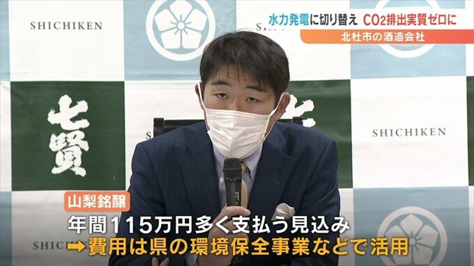 山梨銘醸では年間で115万円多く支払う見込みですが、この費用が県の環境保全事業などで活用されるうえ、発電時に二酸化炭素を排出しないため、約510tの二酸化炭素の排出が実質ゼロになるということです。