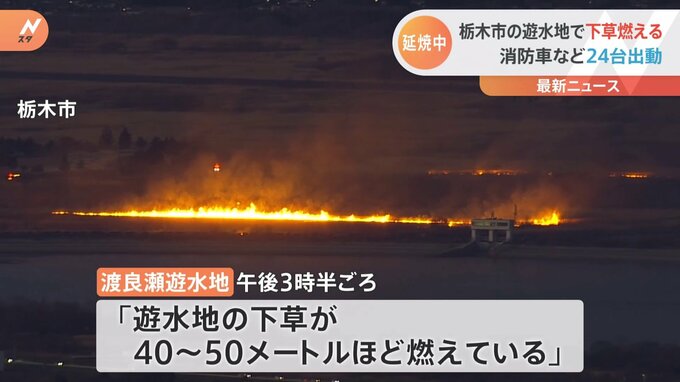 栃木市の渡良瀬遊水地で下草が燃える火事があり、延焼中です。これまでのところけが人はいません。池のほとりに生えている草が燃え、炎が広がっています。きょう午後3時半ごろ、栃木市の渡良瀬遊水地で通行人から…
