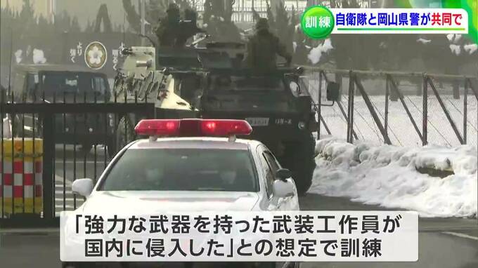 岡山県奈義町の陸上自衛隊日本原駐屯地で、岡山県警と自衛隊による共同訓練が行われました。(陸上自衛隊特科隊 楯貴博副隊長)「安全に留意しつつ、警察と自衛隊の相互の意思の疎通を一層深めるためそれぞれ自覚…