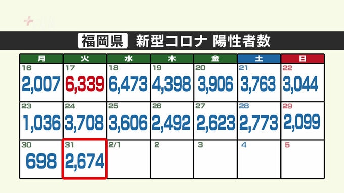新型コロナウイルスの感染状況です。福岡県では31日、新たに2674人の陽性が確認されました。発表自治体別の内訳は、福岡市が840人、北九州市が403人、久留米市が130人などとなっています。県内…