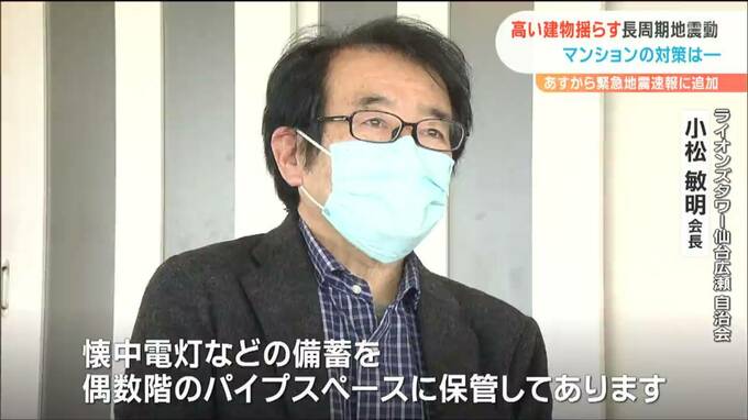ライオンズタワー仙台広瀬 自治会小松敏明会長:「懐中電灯だとかいろんな備蓄を偶数階のパイプスペースに備蓄してあります。1番最初は地下の方にまとめてあったんですが、地下では実際に取りに行くのが大変なので、備品は散らしておいて、いざというときにそちらから取り出せるようにしています」