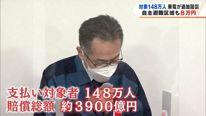 これを受け、東京電力は31日、追加賠償の金額や対象の地域などの概要を発表し、支払いの対象者は148万人、賠償の総額はおよそ3900億円にのぼる見通しを明らかにしました。