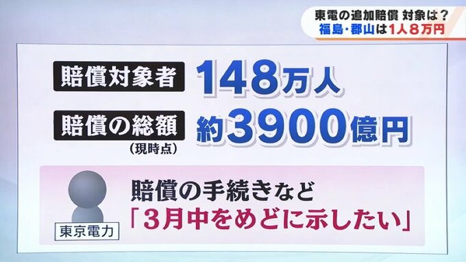 東京電力によりますと、現時点での支払い対象者は148万人。賠償の総額はおよそ3900億円に上る見通しです。東京電力は、賠償の支払い開始の時期、手続きなどについては「3月中をめどに示したい」としています。