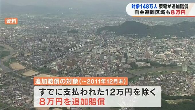 また、2011年12月末までに福島市や郡山市など県内23市町村の「自主的避難等対象区域」で生活していた子どもと妊婦以外の住民に対しては、すでに支払われた12万円を除く8万円を追加で支払います。