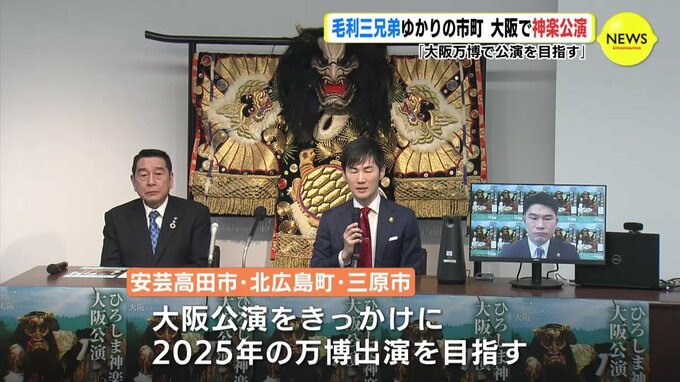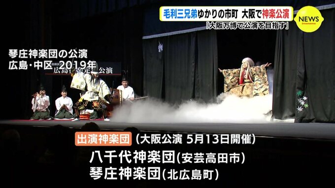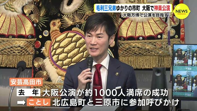 戦国の武将・毛利元就の3人の息子たちにゆかりのある広島県の市と町が、5月に神楽の大阪公演を実施することになりました。(1日 記者会見で発表)