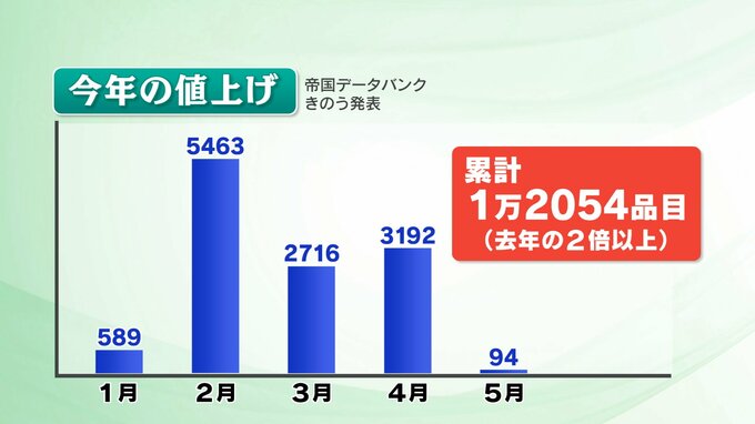 帝国データバンクによりますと、今年値上げする商品は4月までに1万品目を超える見通しで、去年の2倍のペースで進んでいるといいます。