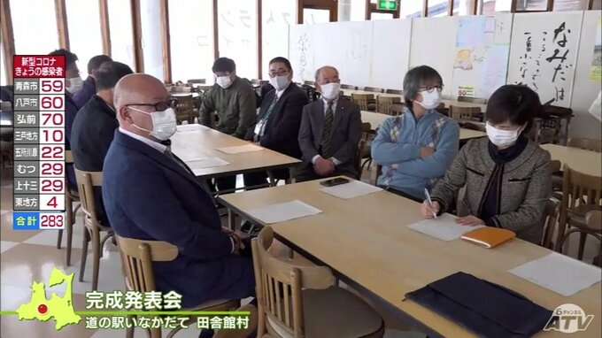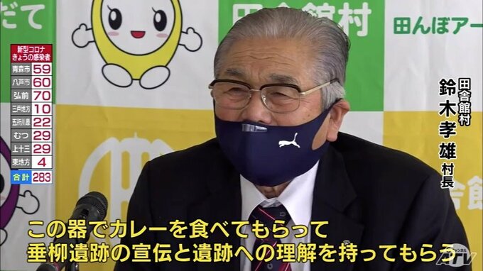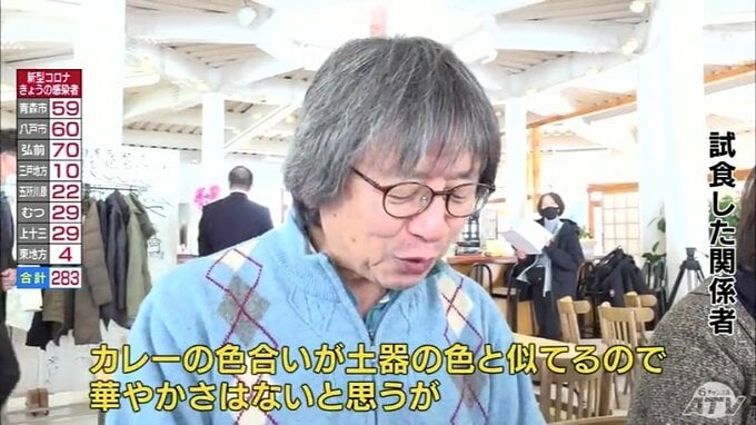 田舎館村の新名物「土器カレー」。「道の駅いなかだて」での完成発表会では、田舎館村の鈴木孝雄(すずき・こうゆう)村長たちが「土器カレー」誕生の経緯を説明しました。
