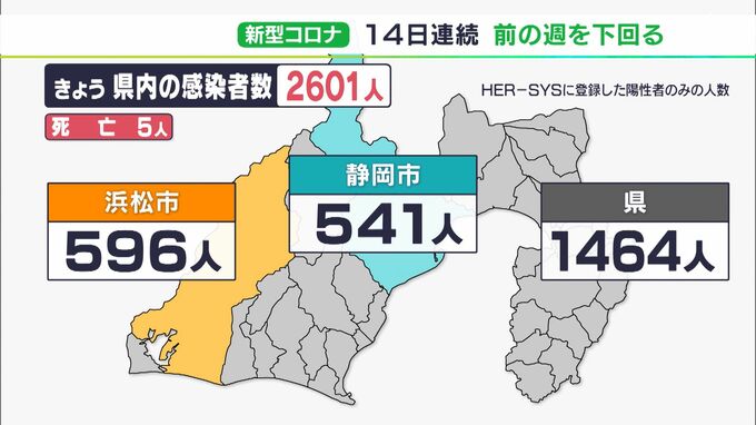 2月1日、静岡県内では新たに2,601人が新型コロナウイルスに感染したことが分かりました。14日連続で前の週を下回っています。新たな感染者は浜松市が596人、静岡市が541人、その他の市や町の合計が1,464人です。静…