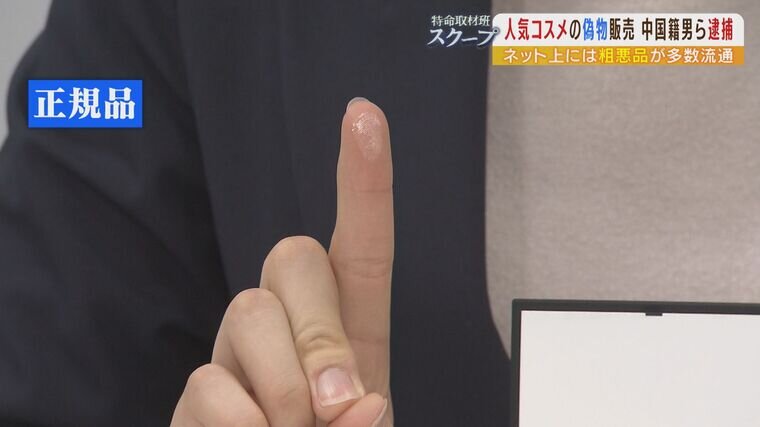 「正規品のパウダーです。触ってみるとかなり滑らかです。さらさらの手触りですね。そして指を見てみると薄くラメが伸びているような状態です」