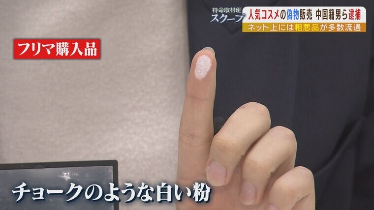 触った指を見比べてみると、正規品は透明だが、フリマサイトで購入したパウダーは真っ白だ。