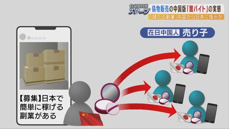実は偽物の化粧品の出品者はこの「レッド」で集められた売り子だという。その仕組みはこうだ。まず中国にいる人物が「レッド」に「日本で簡単に稼げる副業がある」などのメッセージを投稿して売り子を募る。それに応募した在日中国人などに日本のフリマサイトなどで偽物の商品を販売させているのだ。