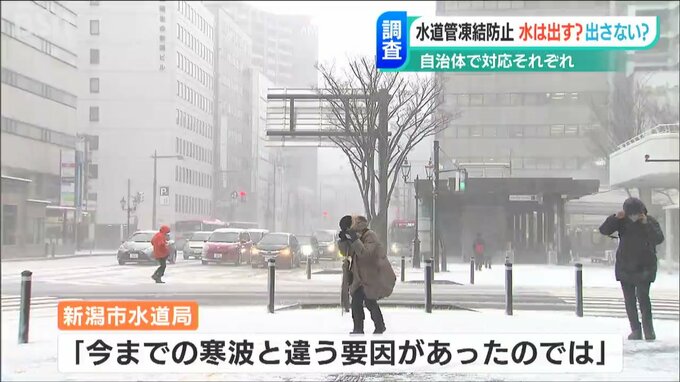 水を出しっ放しで使われた水の量と、雪を溶かすために使われた量、水道管の破裂による漏水の量、新潟市はその割合を把握する方法はないとしながらも、「今までの寒波と違う要因があったのでは」と分析しています。