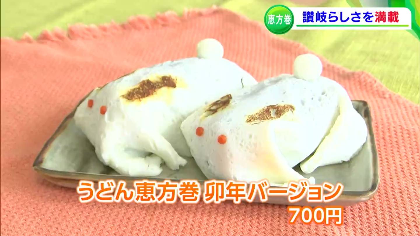 (古川豪太記者リポート)「こちら、かわいらしいうさぎの姿をしていますが、恵方巻なんです。恵方巻らしく丸かじりしてみると、中には香川県らしくうどんが入っています」