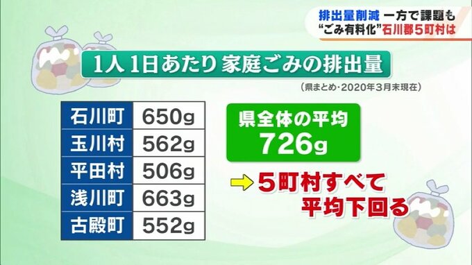 また、県のまとめによりますと、2020年3月末現在、1人1日当たりの家庭ごみの排出量は、石川町で650グラム、玉川村で562グラムなどとなっていて、5町村すべてが県全体の平均を下回っています。