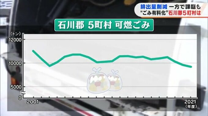 石川地方生活環境施設組合によりますと、5町村では、有料化前の2001年度はおよそ1万1000トンの可燃ごみが出ていましたが、有料化してからは緩やかに減少しています。