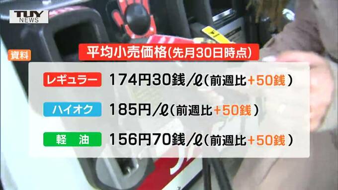 山形県内最新のレギュラーガソリンの平均小売価格は174円30銭で、2週連続の値上がりとなりました。資源エネルギー庁によりますと、先月30日時点の県内レギュラーガソリンの平均小売価格は、1リットルあたり前の週…