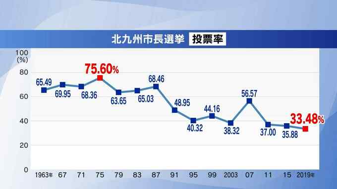 北九州市長選挙の投票率は、1975年の75.60%をピークに減少傾向が続き、前回は過去最低となる33.48%でした。特に20代は10%台に低迷しています。