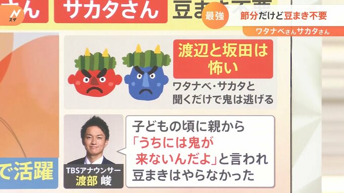 続いて「全国のワタナベさんとサカタさんは豆まき不要」です。