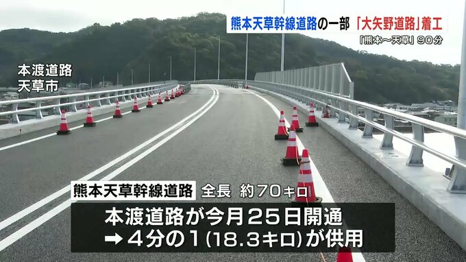 熊本市中心部と天草市を90分で結ぼうと県が整備を進める「熊本天草幹線道路」の一つ、大矢野道路の工事が始まりました。4日の着工式には関係者など約100人が参加しました。大矢野道路は全長3.4キロ。天城橋(てん…