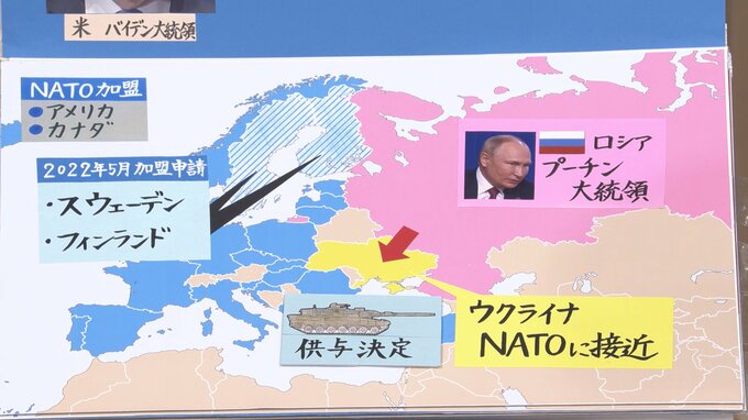 こうしたNATO拡大に不満を募らせたのがロシアのプーチン大統領です。ウクライナがNATOに接近したこともあり、そうした状況を口実にウクライナ侵攻へと踏み切りました。そして今、ロシアの脅威を前に、新たにスウェーデンとフィンランドもNATOへの加盟を申請。プーチン大統領をさらにいら立たせています。NATO加盟国からはウクライナに対し戦車など攻撃力の高い兵器の供与も決まり、ロシアとの緊張は高まるばかり。