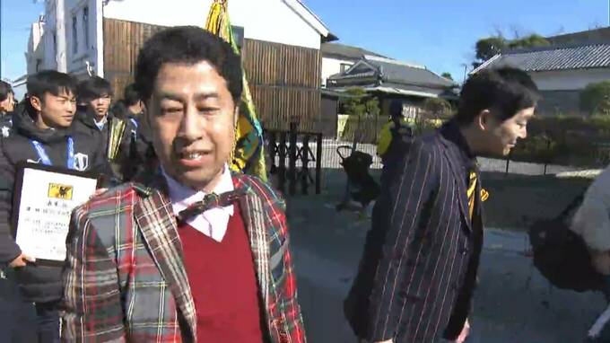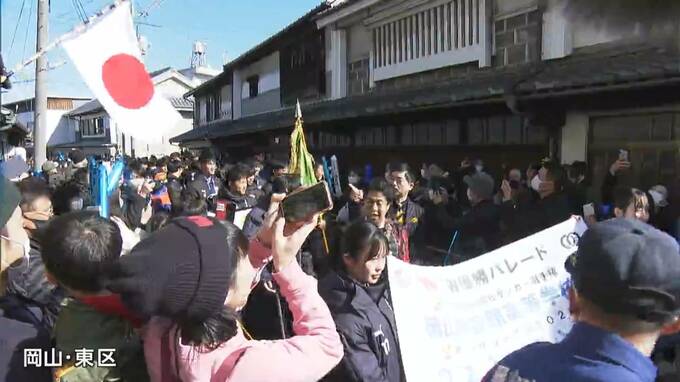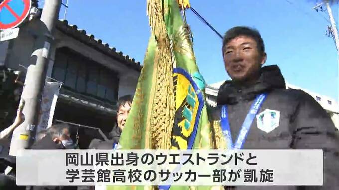 全国高校サッカーで優勝した岡山学芸館高校サッカー部と去年暮れのM―1グランプリで優勝した岡山出身の「ウエストランド」が岡山市東区の西大寺地区で優勝パレードに臨みました。