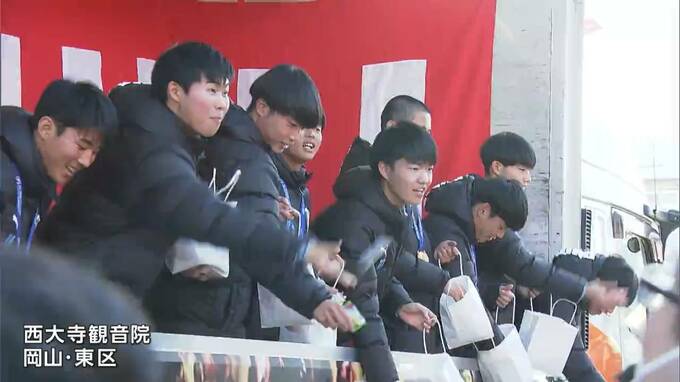 その後2組は3年ぶりとなる西大寺観音院の節分祭の豆まきにも参加し参拝者のもとに福を届けました。