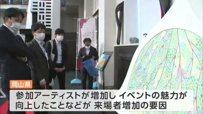 主催した岡山県では参加アーティストが増えて、イベントの魅力が向上したことなどが来場者の増加につながったと分析しています。また会期が終了した現在も14アーティストの作品が宿泊施設などに展示されているということです。