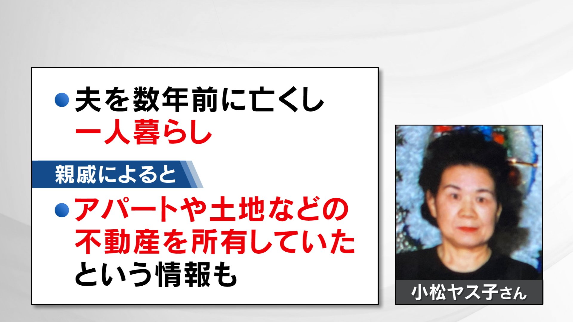 小松さんの親戚に取材したところ、小松さんは、アパートや土地といった不動産を複数所有していたという情報もありました。