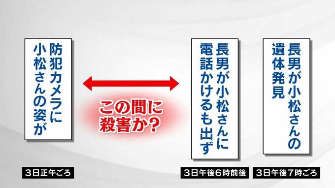 捜査本部では、3日の正午ごろから午後7時までの間に小松さんが殺害されたとみています。